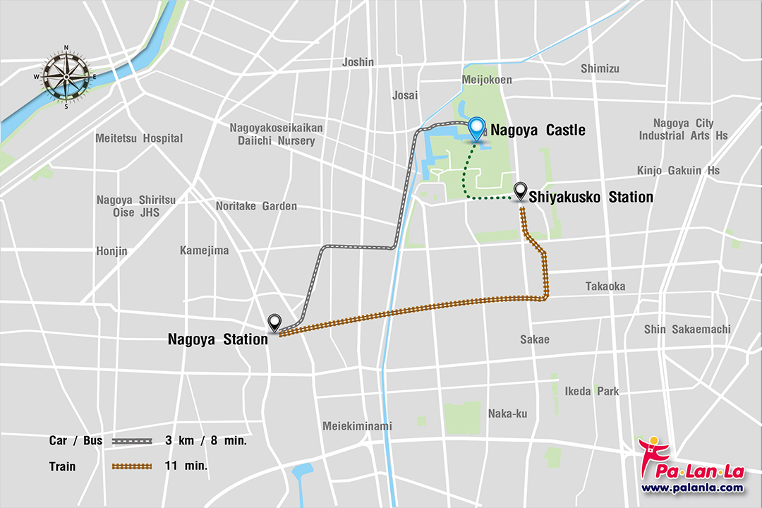 - รถยนต์ จาก Nagoya Station ไปยังปราสาทนาโกย่า ระยะทางประมาณ 3 กิโลเมตร ใช้เวลาเดินทางประมาณ 8 นาที