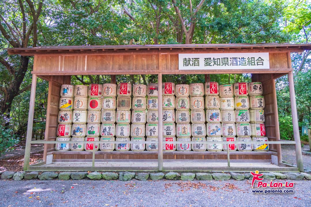 ศาลาเก็บถังสาเกที่ผู้มาสักการะศาลเจ้านำมาบริจาค