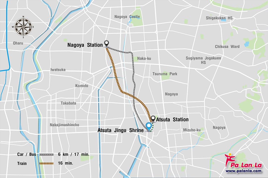 - รถยนต์ จาก Nagoya Station ไปยังศาลเจ้าอัตสึตะ จิงกู ระยะทางประมาณ 6 กิโลเมตร ใช้เวลาเดินทางประมาณ 17 นาที