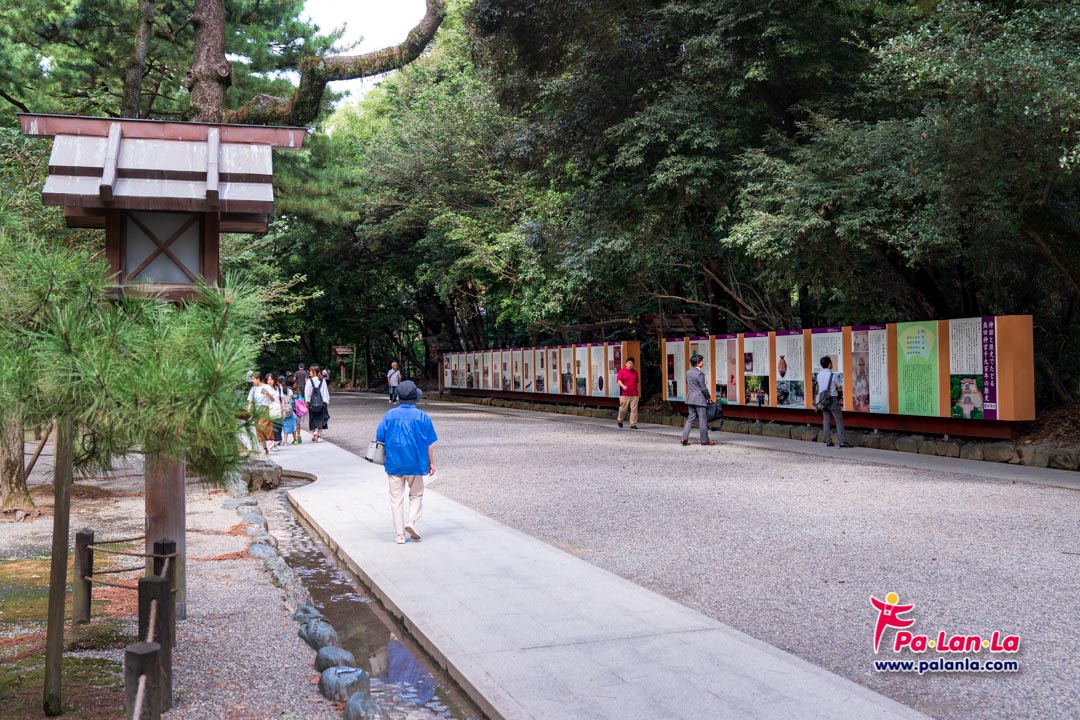 ทางเดินปูหินที่กว้างขวางและขนาบไปด้วยพื้นที่สีเขียวของศาลเจ้า