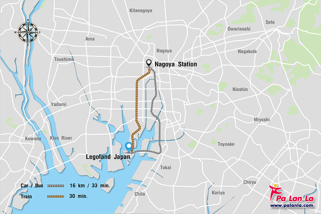 - รถยนต์ จาก Nagoya Station ไปยัง สวนสนุกเลโก้แลนด์ ระยะทางประมาณ 16 กิโลเมตร ใช้เวลาเดินทางประมาณ 33 นาที