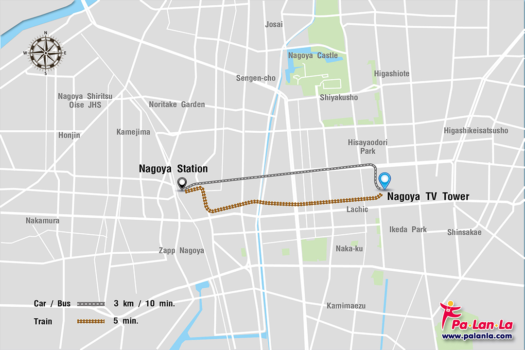 - รถยนต์ จาก Nagoya Station ไปหอคอยนาโกย่า ทีวี ทาวเวอร์ ระยะทางประมาณ 3 กิโลเมตร ใช้เวลาเดกินทางประมาณ 10 นาที
