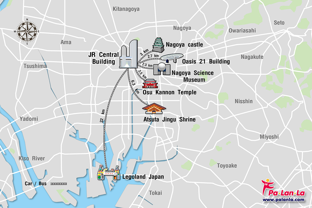 - รถยนต์ จาก Nagoya Station ไปยัง สวนสนุกเลโก้แลนด์ ใช้เวลาเดินทางประมาณ 33 นาที