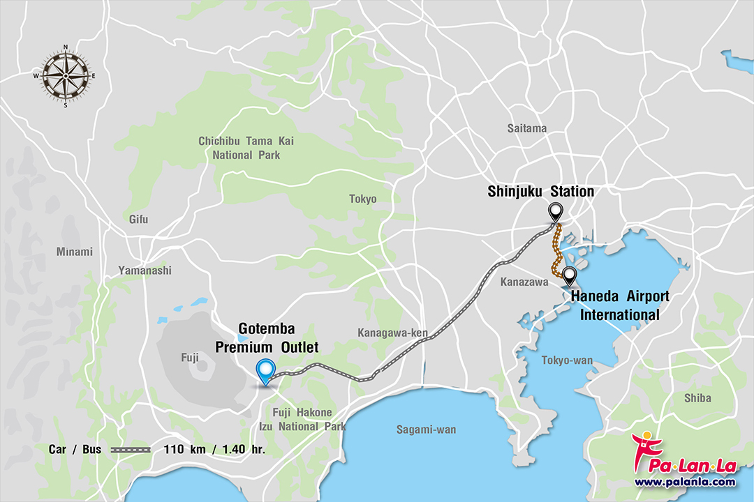 - รถยนต์ จากสนามบินฮาเนดะไปยังโกเทมบะ พรีเมี่ยม เอ้าท์เลต ระยะทางประมาณ 110 กิโลเมตร ใช้เวลาเดินทางประมาณ 1.40 ชั่วโมง