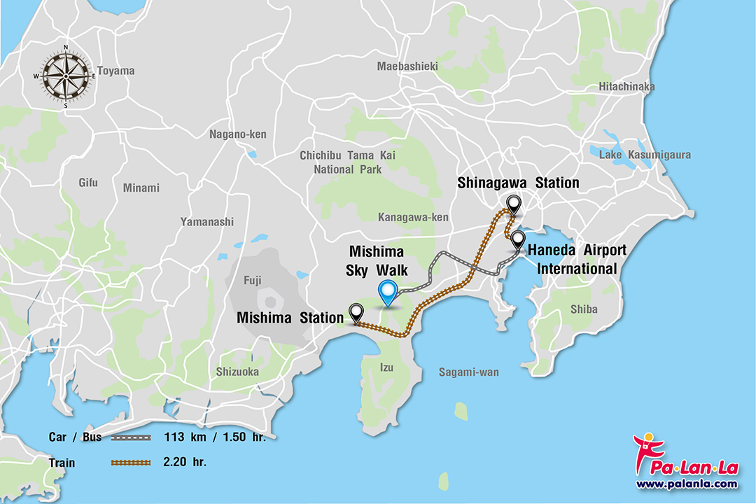 - รถยนต์ จากสนามบินฮาเนดะไปยังมิชิมะ สกายวอล์ค ระยะทางประมาณ 113 กิโลเมตร ใช้เวลาเดินทางประมาณ 1.50 ชั่วโมง