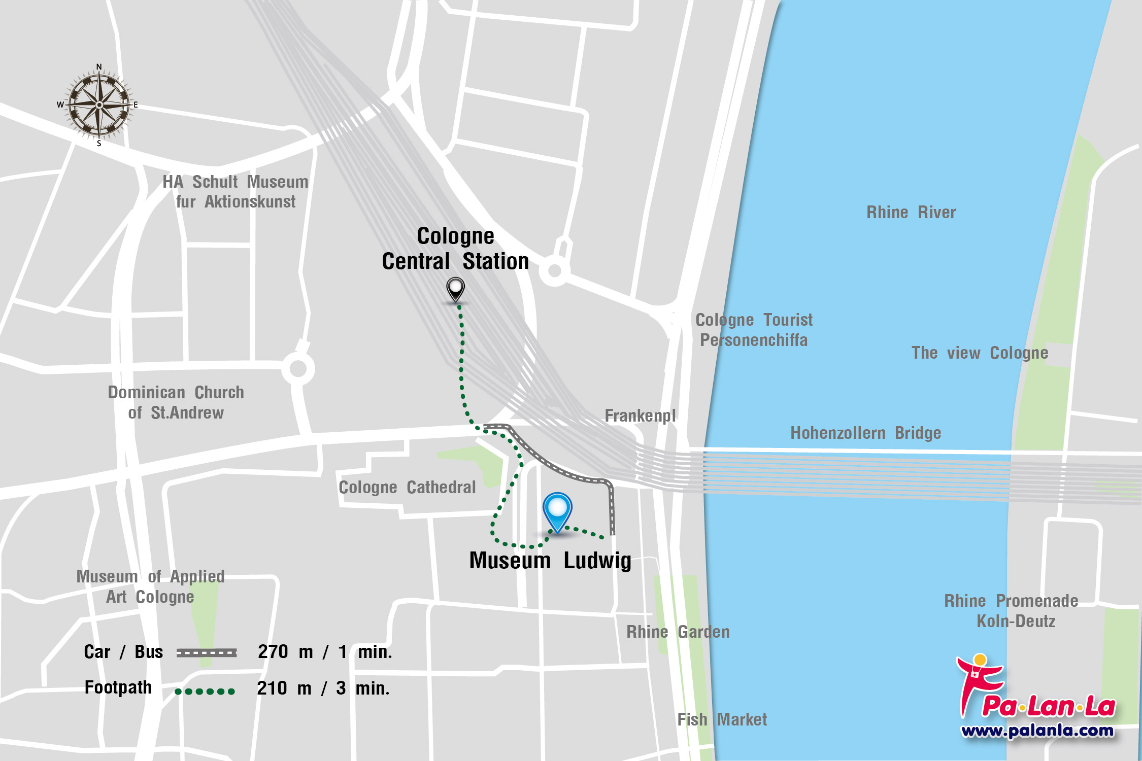 - รถยนต์ (Car) จาก Cologne Central Station ไปยัง Museum Ludwig มีระยะทางประมาณ 270 เมตร ใช้เวลาเดินทางประมาณ 1 นาที