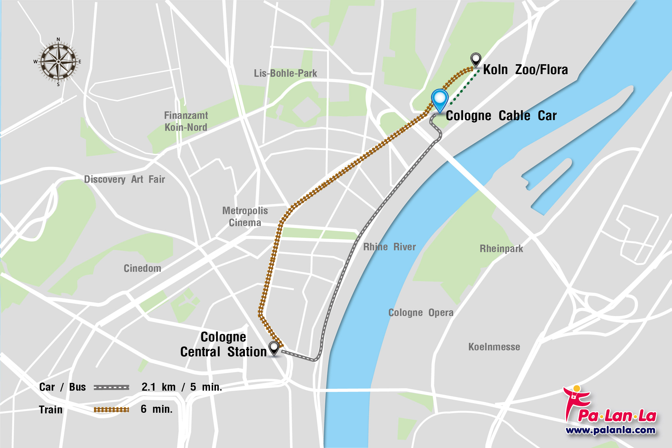 - รถไฟ (Train) จาก Cologne Central Station ให้ขึ้นรถไฟสายสีฟ้า ลงสถานี Köln Zoo/Flora และเดินต่อไปยัง Cologne Cable Car ประมาณ 60 เมตร ใช้เวลาเดินทางประมาณ 6 นาที
