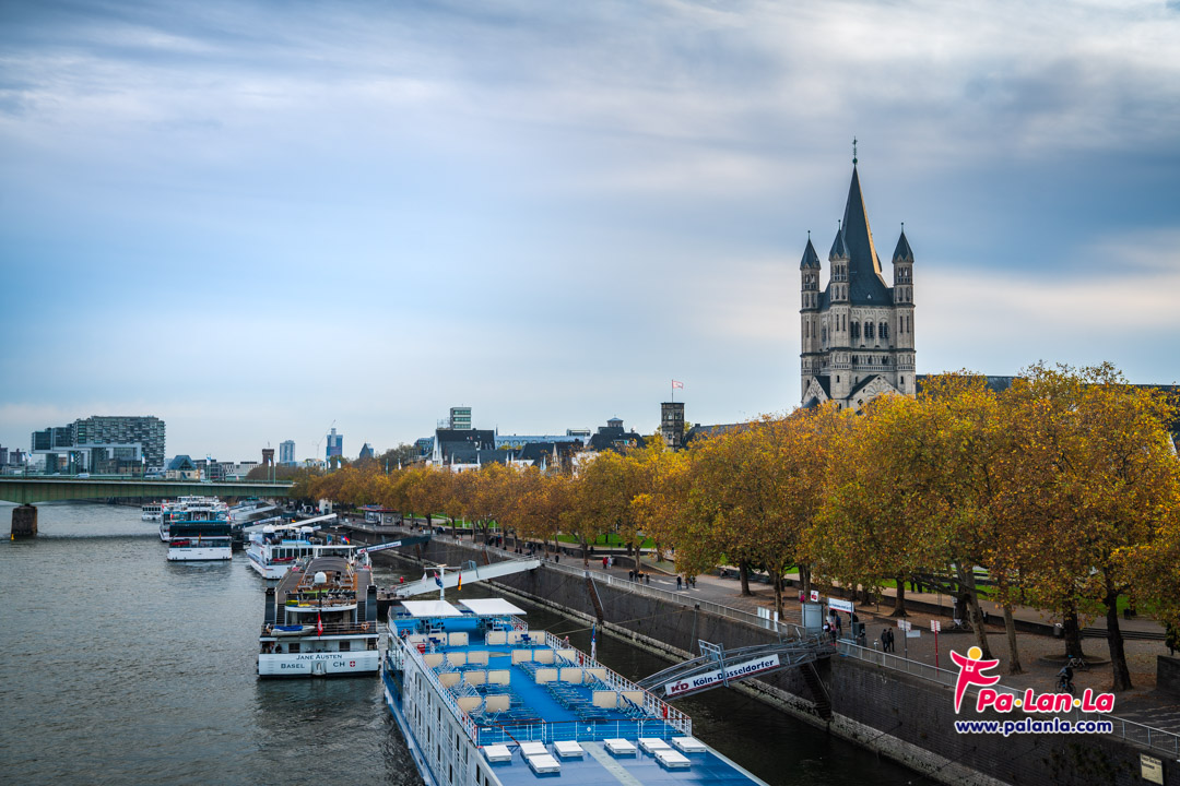 โบสถ์เกรทเซนต์มาร์ตินถ่ายจากสะพานโฮเอินซอลเลิร์นริมแม่น้ำไรน์ในช่วงฤดูใบไม้เปลี่ยนสีก่อนเข้าสู่ฤดูหนาว