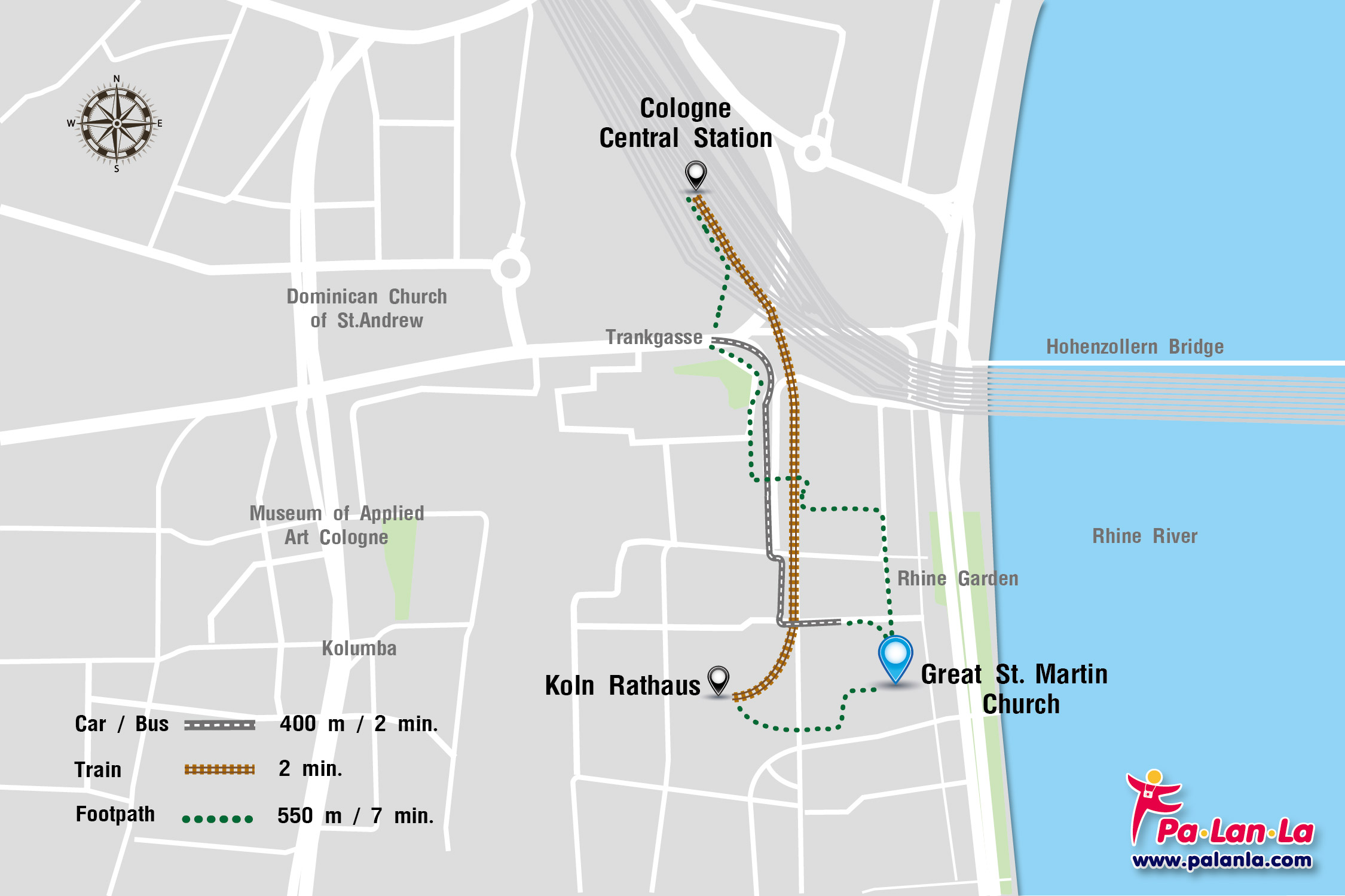 - เดิน (Footpath) จาก Cologne Central Station ไปยัง Great St. Martin Church มีระยะทางประมาณ 550 เมตร ใช้เวลาเดินทางประมาณ 7 นาที