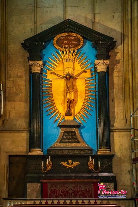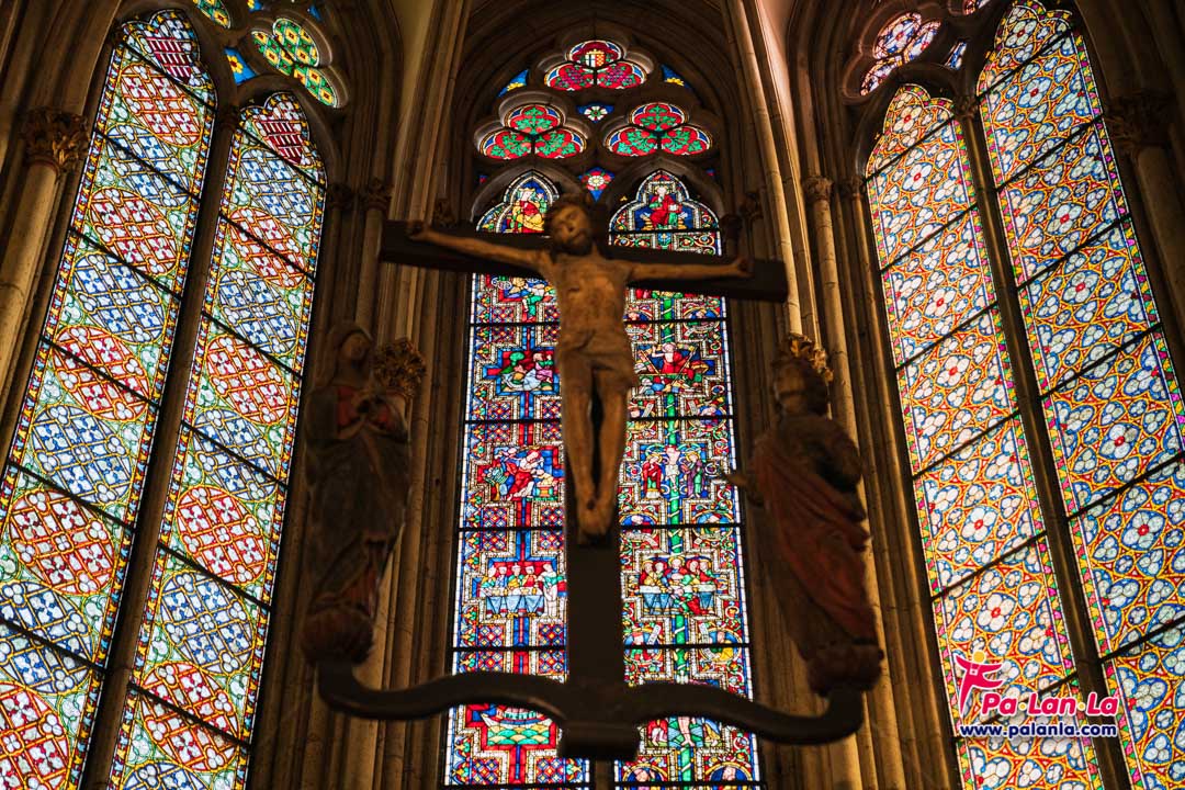 ประติมากรรมพระเยซูคริสต์ถูกตรึงกางเขน ด้านหลังเป็นหน้าต่างที่ตกแต่งด้วยกระจกโมเสกถ่ายทอดความงดงามของศิลปะและเรื่องราวทางศาสนาคริสต์