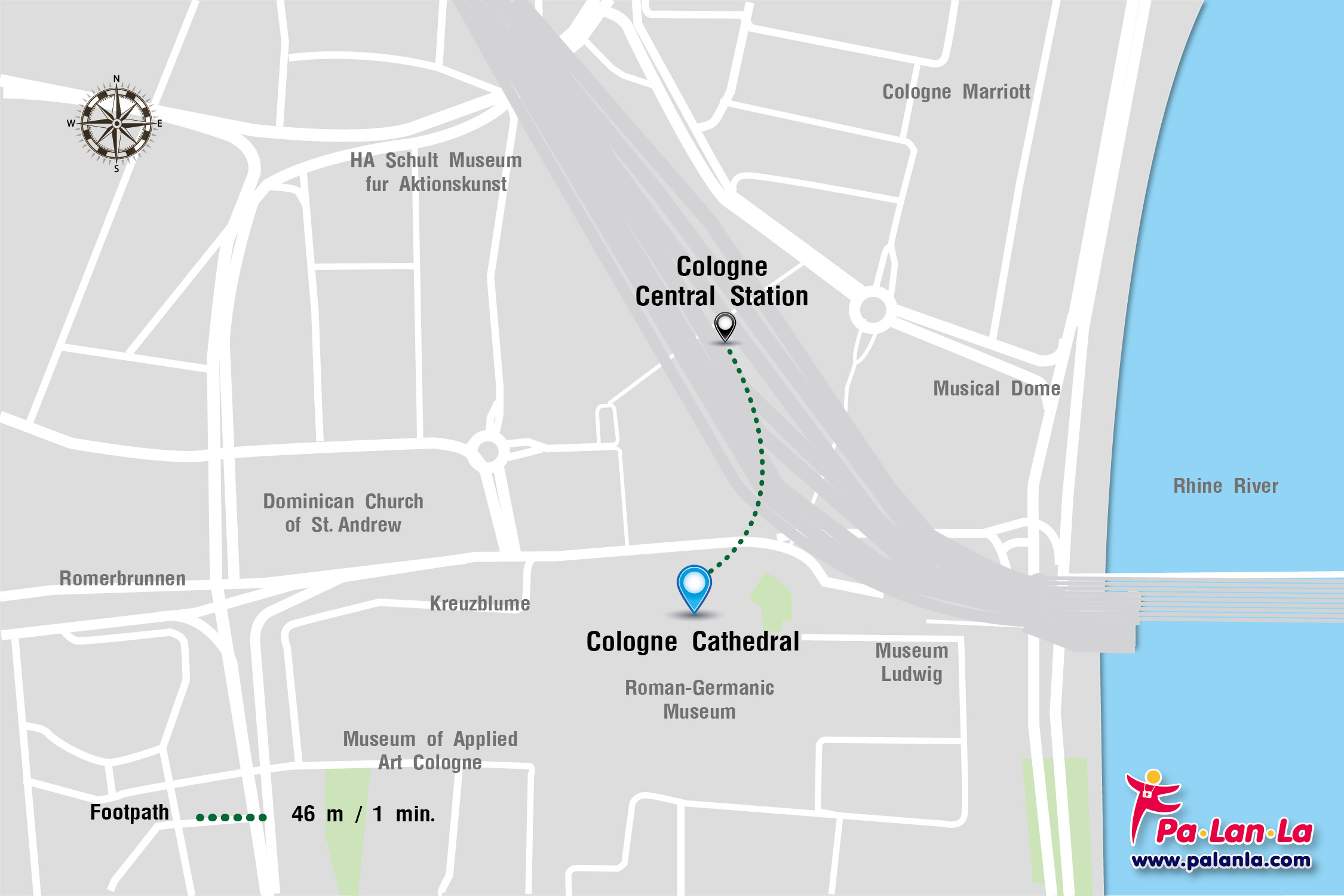 - เดิน (Footpath) จาก Cologne Central Station ไปยัง Cologne Cathedral มีระยะทางประมาณ 46 เมตร ใช้เวลาเดินทางประมาณ 1 นาที