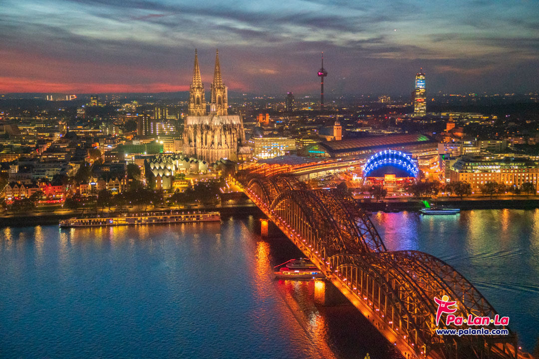 ความสวยงามของมหาวิหารโคโลญและสะพานโฮเอินซอลเลิร์นในยามราตรี จากด้านบนหอชมเมืองโคโลญไทรแองเกิล