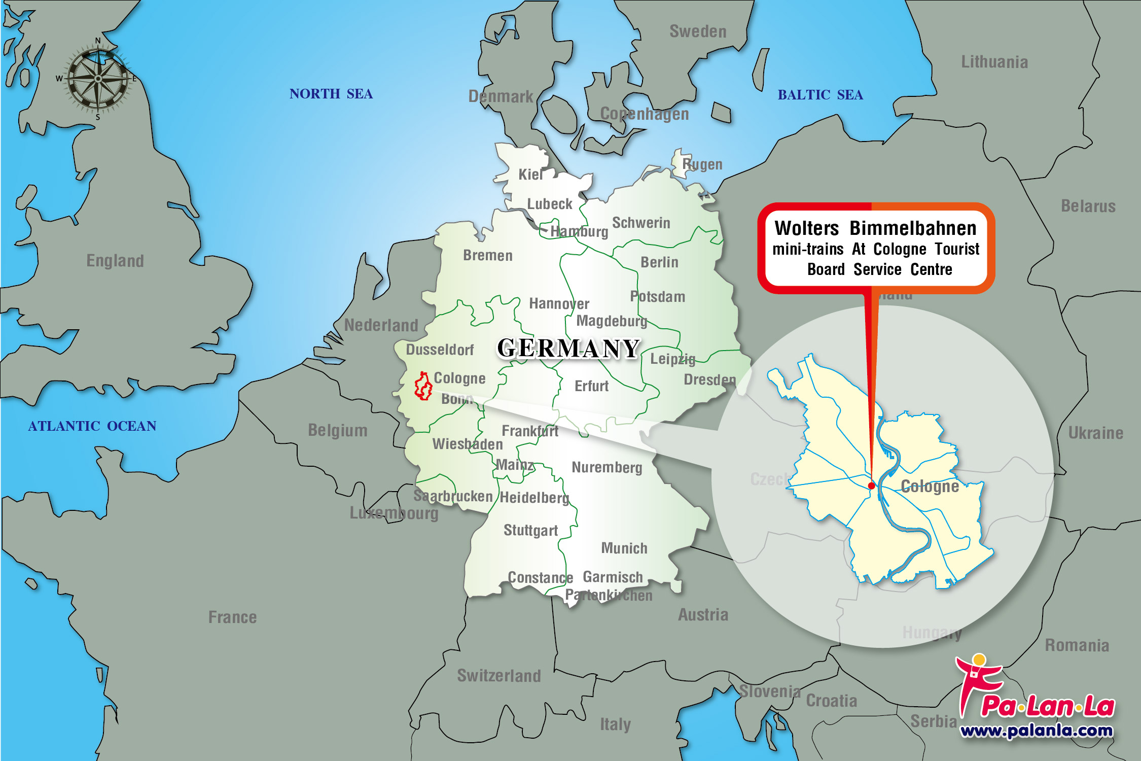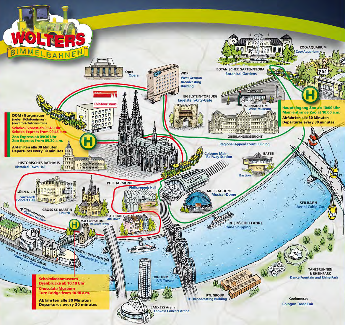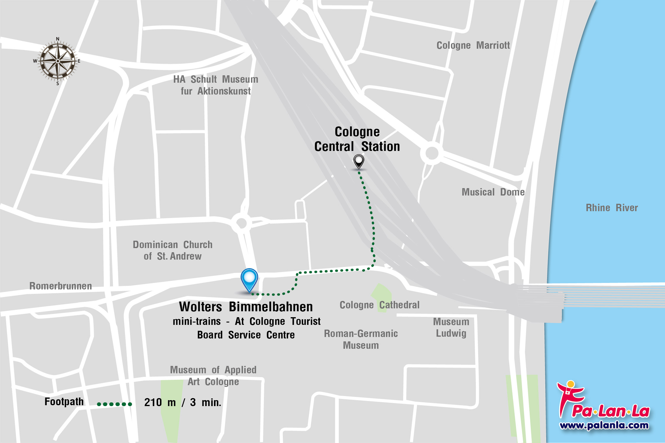 แผนที่ตั้ง จุดจอดรถไฟเล็กวอลเตอร์บิมเมลบาเนน ที่ศูนย์บริการการท่องเที่ยวเมืองโคโลญ (Wolters Bimmelbahnen mini-trains - At Cologne Tourist Board Service Centre)
