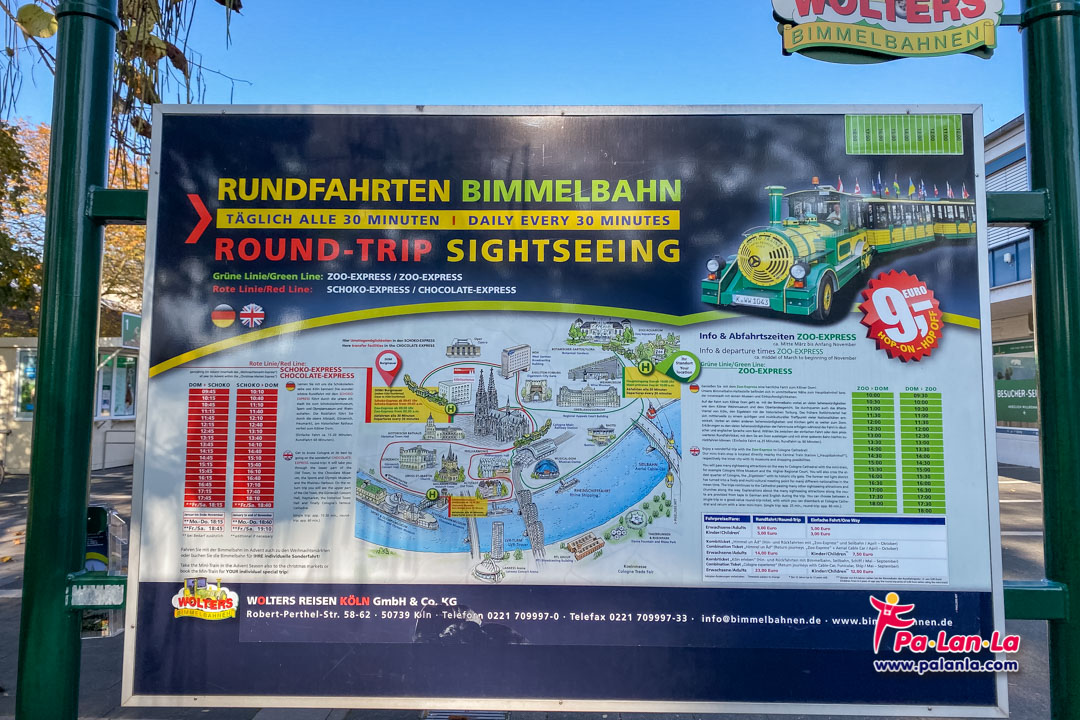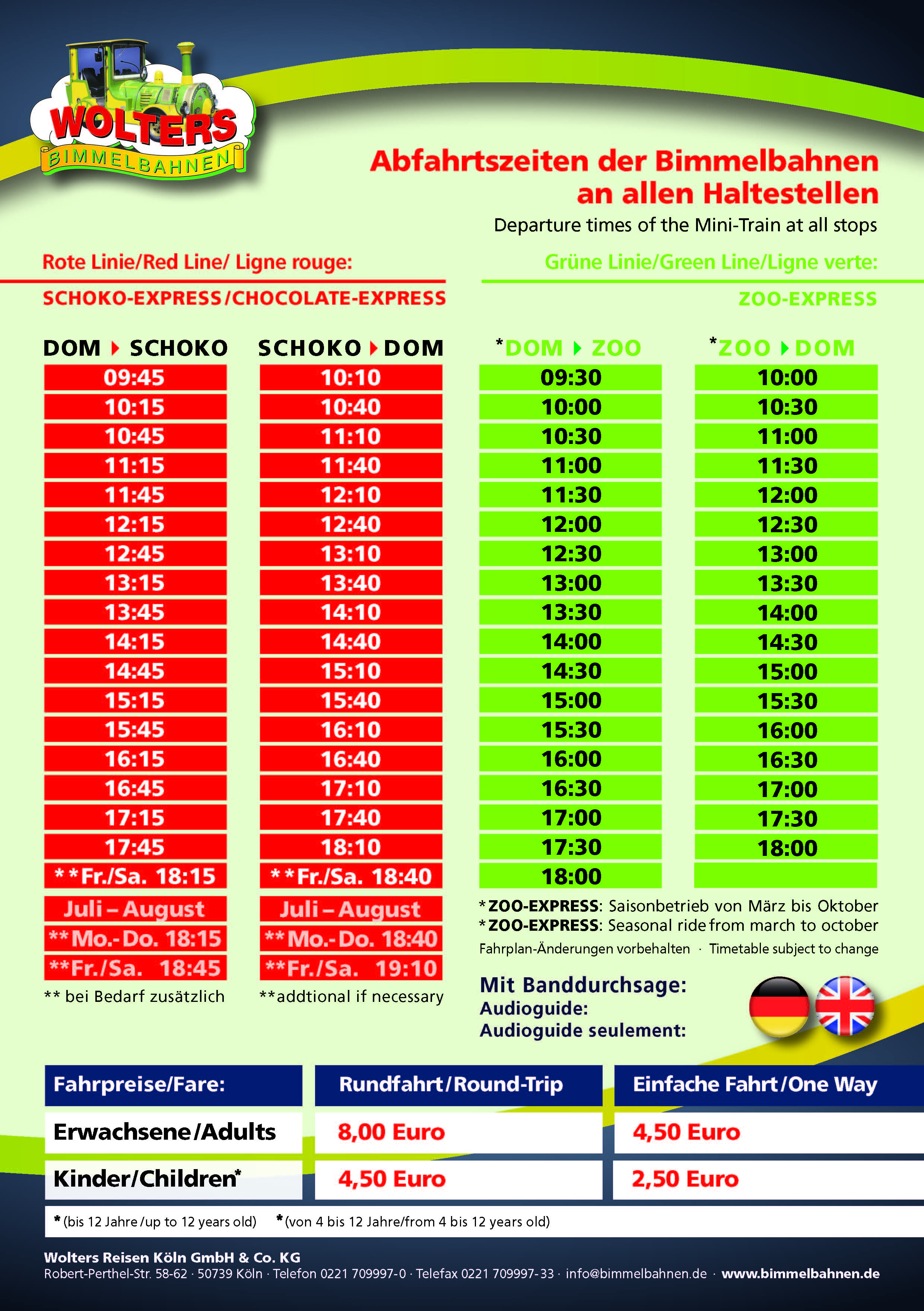 ตารางเวลาการเดินทาง ช่องสีแดงคือ มหาวิหารโคโลญ-พิพิธภัณฑ์ช็อคโกแลต และ พิพิธภัณฑ์ช็อคโกแลต-มหาวิหารโคโลญ ช่องสีเขียวคือ มหาวิหารโคโลญ-สวนสัตว์ และ สวนสัตว์-มหาวิหารโคโลญ สำหรับช่องสีขาวด้านล่างคือราคาค่าโดยสารแบบไปกลับ และแบบเที่ยวเดียว ขอบคุณภาพจาก https://bimmelbahnen.com)