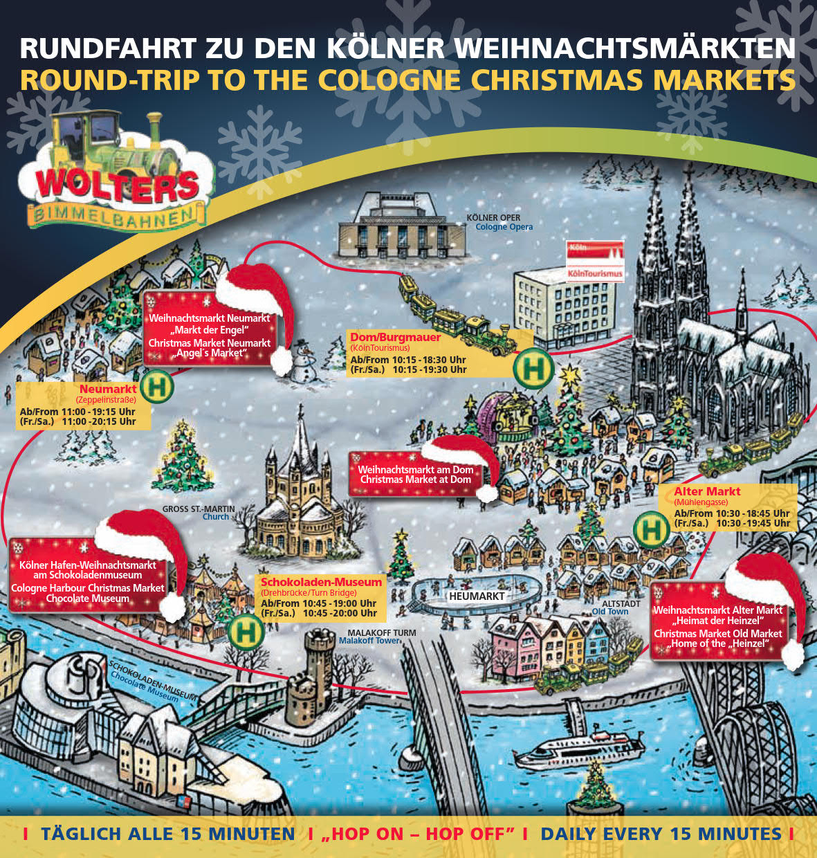 ในช่วงคริสต์มาสจะมีเส้นทางพิเศษพาเที่ยวชมตลาดคริสต์มาสเมืองโคโลญ (Cologne Christmas markets) ยอดนิยม 4 แห่ง ได้แก่ ตลาดคริสต์มาสบริเวณมหาวิหารโคโลญ ตลาดคริสต์มาสบริเวณตลาดเก่าใกล้กับย่านเมืองเก่า ตลาดคริสต์มาสบริเวณท่าเรือใกล้กับพิพิธภัณฑ์ช็อคโกแลต และตลาดคริสต์มาสย่านตลาดแองเจิล