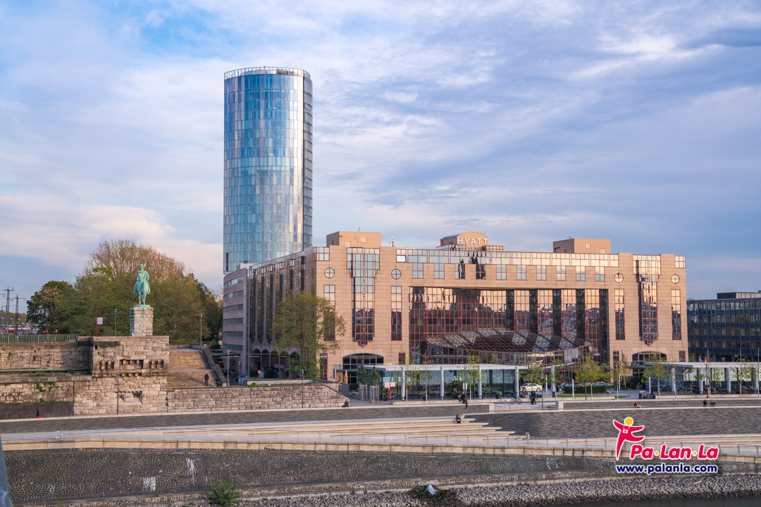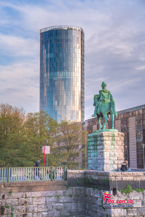 อาคารโคโลญไทรแองเกิลเมื่อมองจากสะพานโฮเอินซอลเลิร์น พระบรมรูปทรงม้าด้านขวาในรูปคือพระบรมรูปทรงม้ากษัตริย์วิลเฮ็ล์มที่ 1