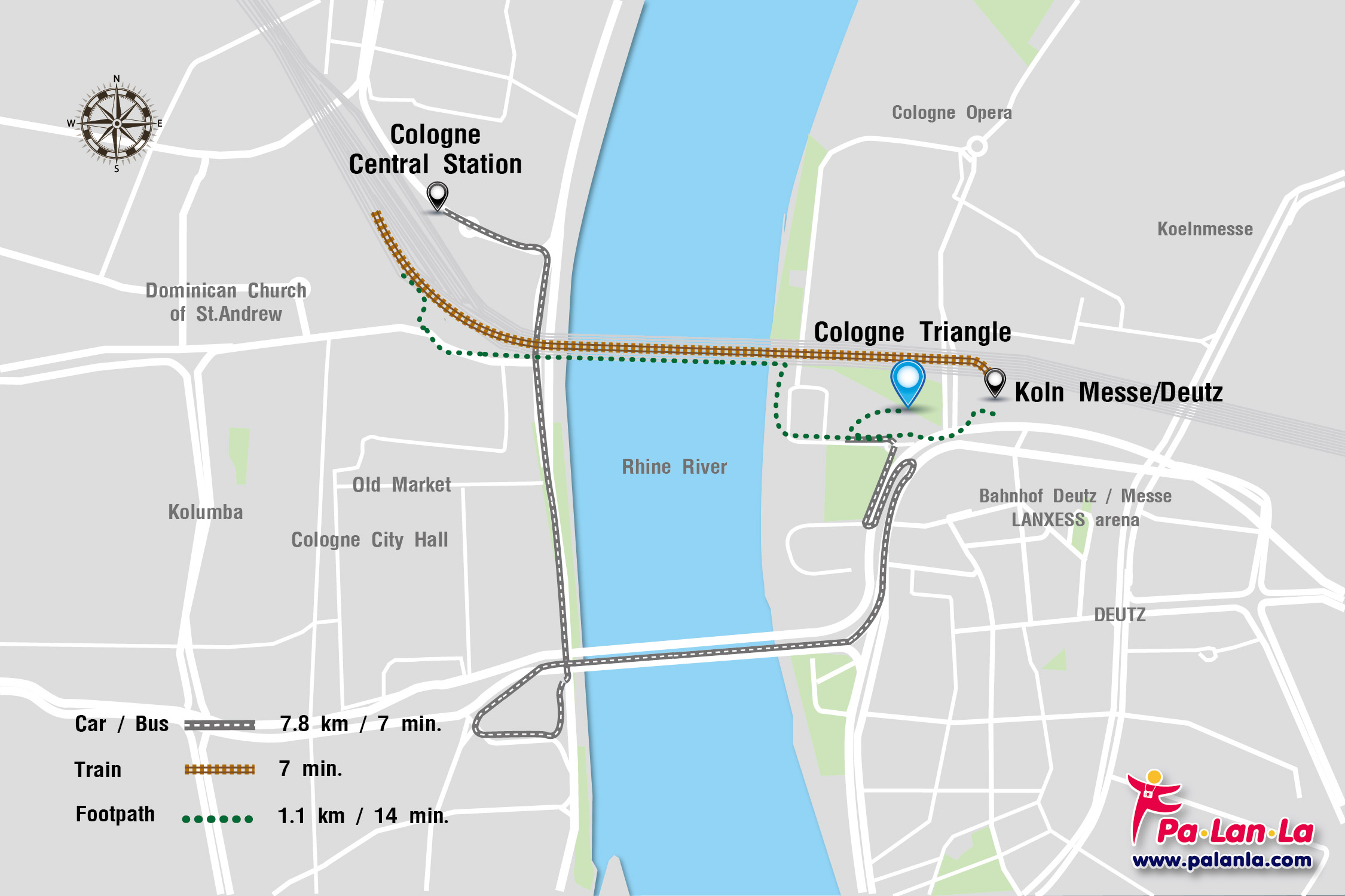 - รถไฟ (Train) จาก Cologne Central Station ให้ขึ้นรถไฟสายสีเขียว ลงสถานี Köln Messe/Deutz และเดินต่อไปยัง Cologne Triangle ประมาณ 600 เมตร ใช้เวลาเดินทางประมาณ 7 นาที