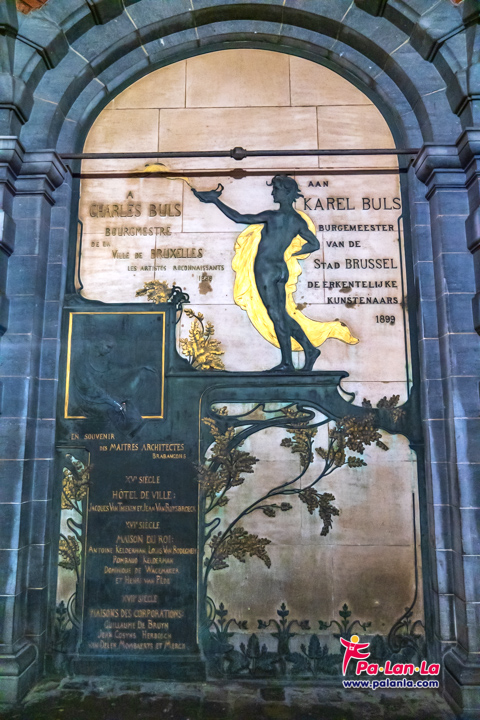 ประติมากรรมระลึกถึงชาร์ล บูลส์ นายกเทศมนตรีคนสำคัญของเมืองบรัสเซลส์ (ซ้าย) ประติมากรรมบอกเล่าเรื่องราวเหตุการณ์ปฎิวัติฝรั่งเศสของเมืองบรัสเซลส์ (ขวา)