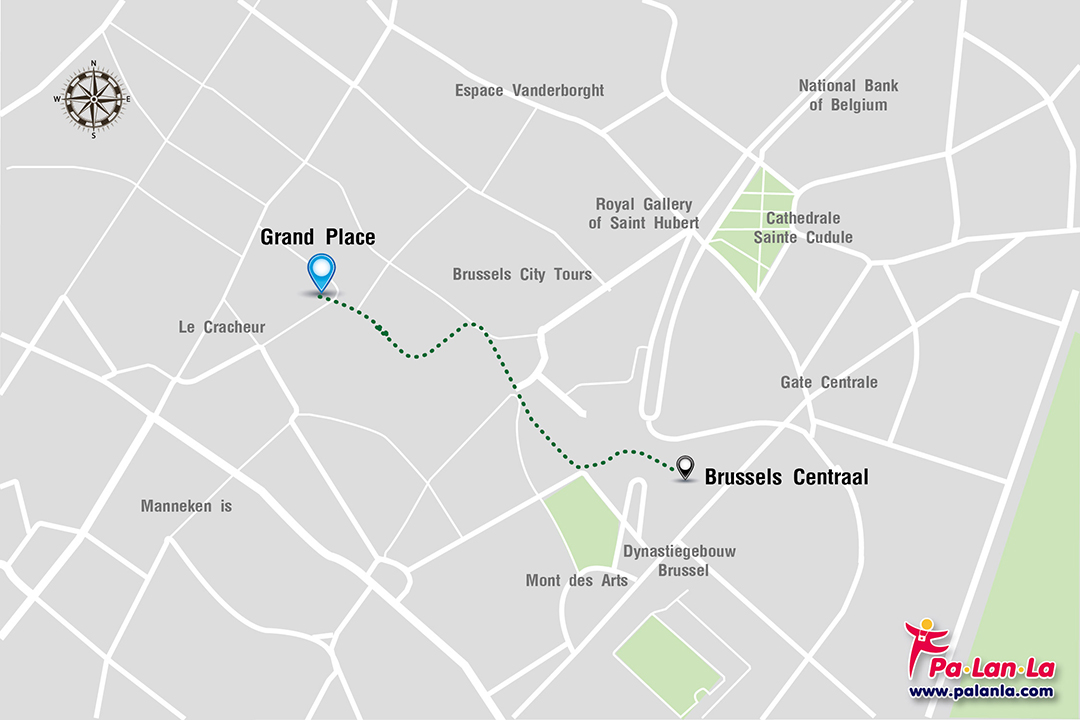 - เดิน จากสถานีรถไฟกลางเมืองบรัสเซลส์สามารถเดินไปยังจัตุรัสกร็อง ปลัสได้เลย ระยะทางประมาณ 450 เมตร ใช้เวลาเดินประมาณ 5 นาที