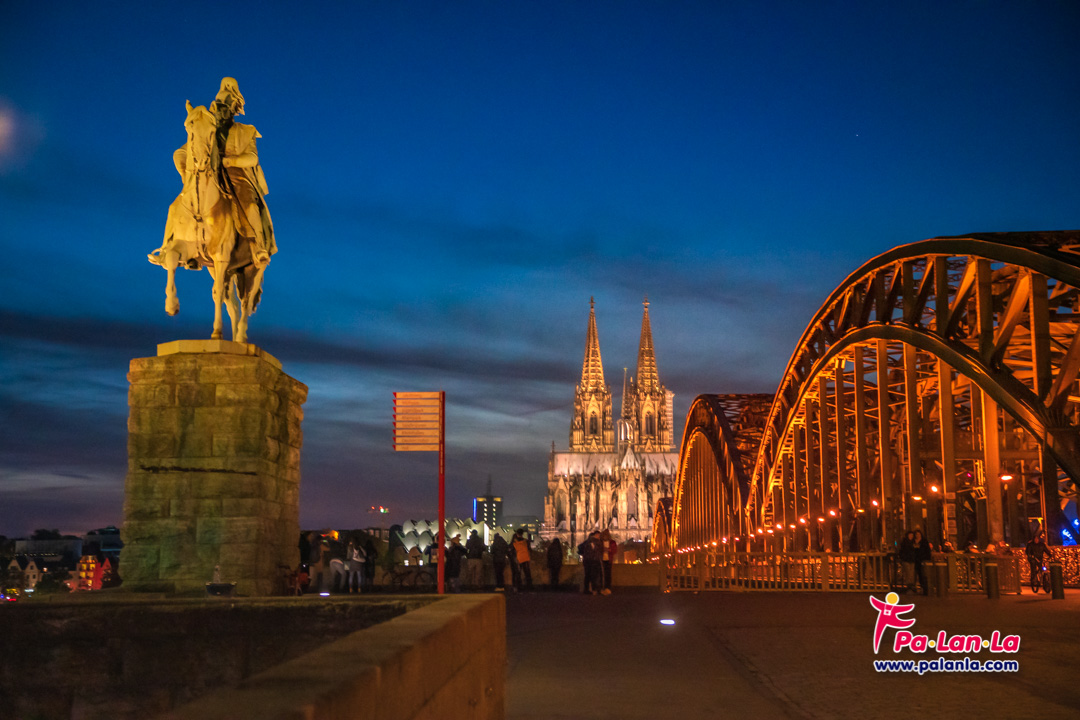เมื่อเดินข้ามสะพานโฮเอินซอลเลิร์นมาแล้ว เราจะเห็นพระบรมรูปทรงม้ากษัตริย์วิลเฮ็ล์มที่ 2 อยู่ทางด้านซ้ายมือของเรา จากนั้นให้เราเดินต่อไปข้างหน้าอีกนิดหน่อยก็จะเข้าสู่บริเวณทางเดินมุ่งสู่มหาวิหารโคโลญ จากบริเวณนี้เราจะสามารถถ่ายภาพของมหาวิหารโคโลญอันงดงามและส่องสว่างตัดกับท้องฟ้าสีน้ำเงินในยามราตรี