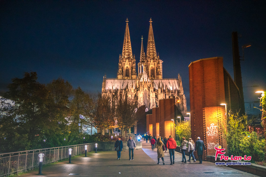 จากมุมถ่ายภาพเดียวกันกับภาพที่ 1 ในช่วงพลบค่ำ จะได้ทัศนียภาพของมหาวิหารโคโลญในแสงสีเขียวเรืองรองจากไฟประดับท่ามกลางแสงระยิบระยับจากหลอดไฟฟ้าตามอาคารบ้านเรือนโดยรอบ และแม่น้ำไรน์ที่มีประกายแสงสะท้อนบนผิวน้ำจากแสงไฟบริเวณสะพานโฮเอินซอลเลิร์น อาคารริมแม่น้ำ และเรือในที่ลอยอยู่ในแม่น้ำ องค์ประกอบเหล่านี้ทำให้เมืองโคโลญมีทัศนียภาพที่งดงามและมีสเน่ห์น่าหลงใหลเป็นอย่างมาก