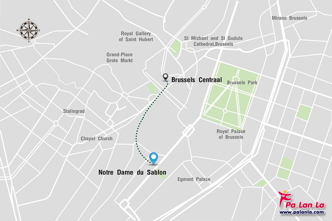 - เดิน จากสถานีรถไฟกลางเมืองบรัสเซลส์ สามารถเดินไปยัง โบสถ์นอทเทอร์ดัมซาบอน ได้เลย ระยะทางประมาณ 700 เมตร ใช้เวลาเดินทางประมาณ 10 นาที