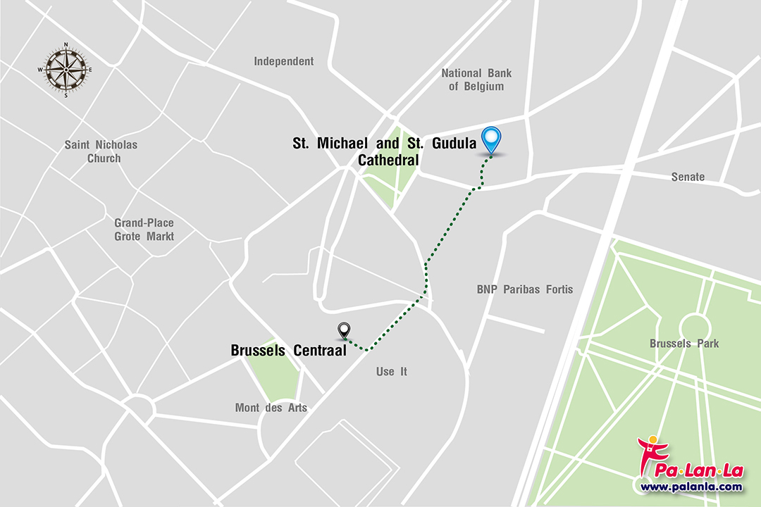 - เดิน จากสถานีรถไฟกลางเมืองบรัสเซลส์ สามารถเดินไปยัง มหาวิหารเซนต์ไมเคิลและเซนต์กูดูลา ได้เลย ระยะทางประมาณ 350 เมตร ใช้เวลาเดินประมาณ 4 นาที