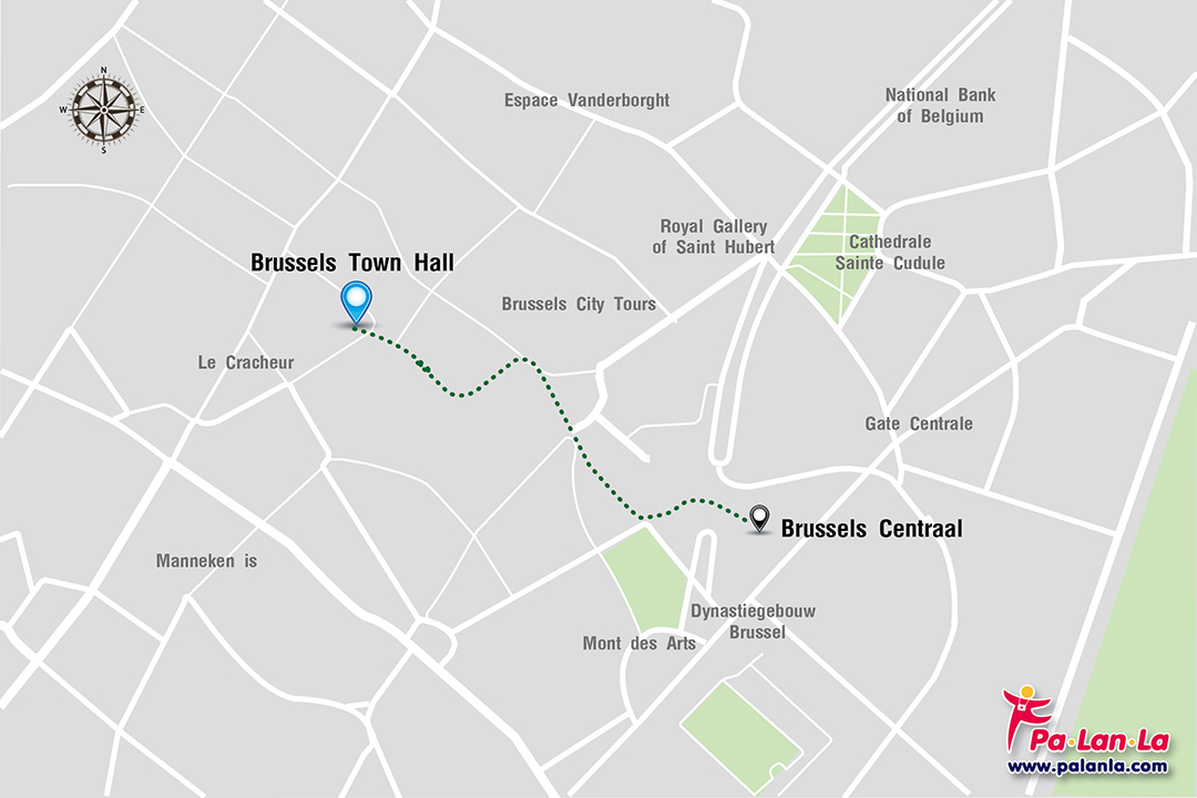 - เดิน จากสถานีรถไฟกลางเมืองบรัสเซลส์สามารถเดินไปยังศาลาว่าการเมืองบรัสเซลส์ได้เลย ระยะทางประมาณ 450 เมตร ใช้เวลาเดินประมาณ 5 นาที