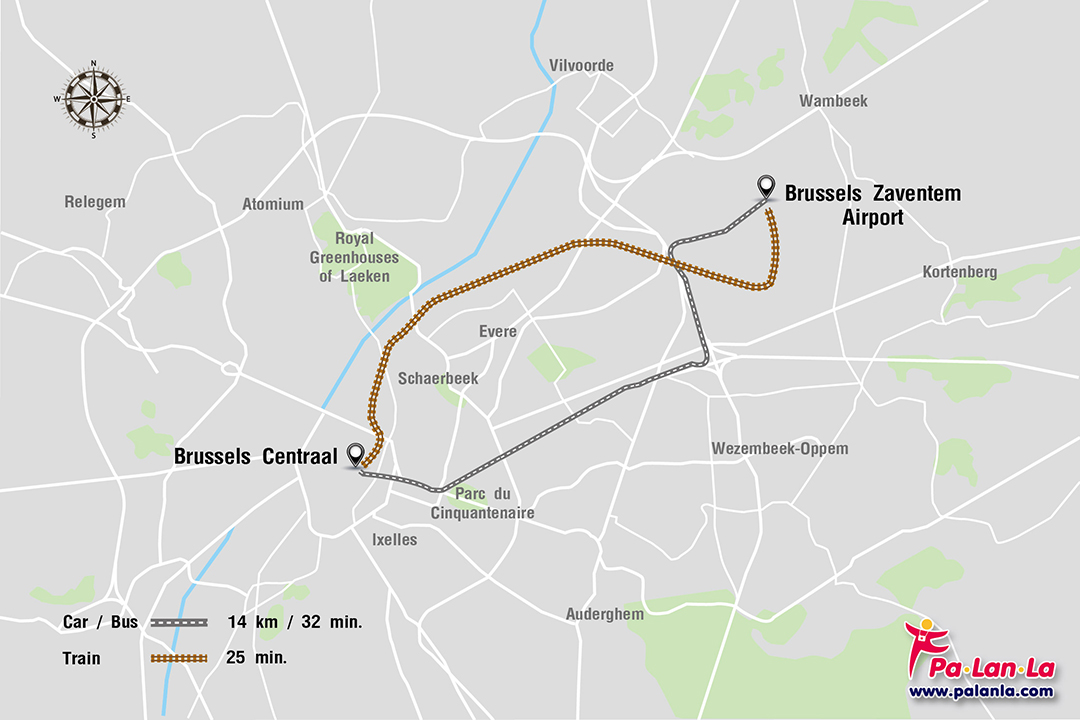 - รถยนต์ จากสนามบินไปยังสถานีรถไฟกลางของเมืองบรัสเซลส์ (Brussels Centraal) ระยะทางประมาณ 14 กิโลเมตร ใช้เวลาเดินทางประมาณ 32 นาที