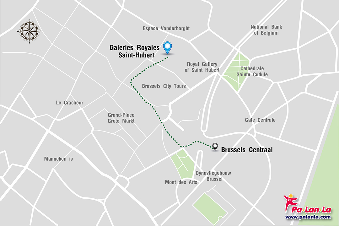 - เดิน จากสถานีรถไฟกลางเมืองบรัสเซลส์ สามารถเดินไปยัง ศูนย์การค้าแกลเลอรี รอยัล แซ็ง อูแบร์ ได้เลย ระยะทางประมาณ 400 เมตร ใช้เวลาเดินประมาณ 4 นาที