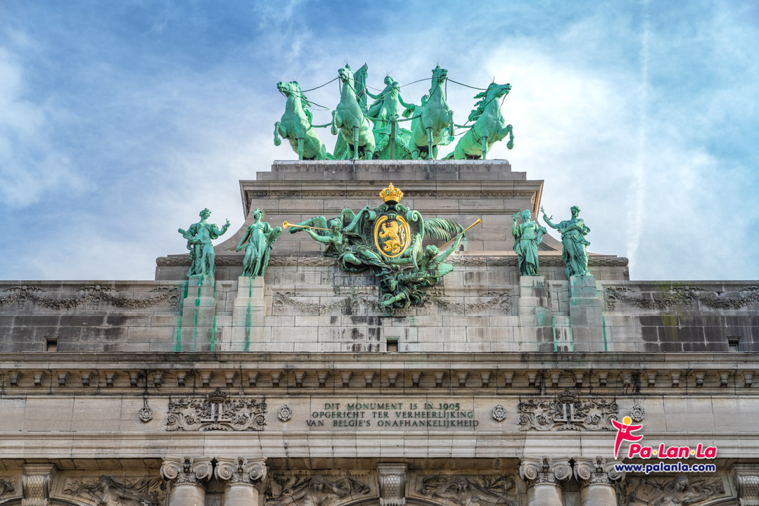 โดยสถาปัตยกรรมที่โดดเด่นที่สุดของสวนคงหนีไม่พ้น ประตูชัย (Parc du Cinquantenaire) ที่ดูแลการสร้างโดยสถาปนิกโจเซฟ บอร์โดซ์ (Joseph Bordian) ซึ่งตอนแรกนั้นประตูชัยมีเพียงอาคารสองหลังที่เป็นเหมือนปีกสมมาตรซึ่งคั่นด้วยเสากลมคู่ที่มีซุ้มประตูเดี่ยวอยู่ตรงกลาง ก่อนที่จะต้องใช้เวลาอีกกว่า 25 ปี ประตูชัยฉบับสมบูรณ์แบบที่เราเห็นกันอยู่ในปัจจุบันจะเสร็จเรียบร้อย ซึ่งประตูชัยแห่งนี้คือตัวแทนของการคะคานอำนาจระหว่างพระมหากษัตริย์กับรัฐบาล โดยหลังจากเสร็จไม่ทันวันครบรอบ 50 ปี ที่ประเทศได้อิสรภาพ พระมหากษัตริย์เลออปอลที่ 2 ก็ต้องการให้เสร็จภายในวาระครบรอบ 75 ปี แต่รัฐบาลรู้สึกไม่สบายใจที่จะต้องใช้เงินทุนของประเทศจำนวนมหาศาลหมดไปกับการสร้างประตูชัย และกว่าปัญหาคาราคาซังนี้จะได้รับการแก้ไข ด้วยการที่พระมหากษัตริย์เลออปอลที่ 2ได้ออกเงินส่วนพระองค์ รวมกับเงินคงคลังในทรัพย์สินส่วนพระมหากษัตริย์มาใช้เป็นทุนเพื่อให้โครงการนี้ดำเนินการก่อสร้างต่อไปได้ สถาปนิกโจเซฟ บอร์โดซ์ ก็ได้เสียชีวิตไปแล้ว งานนี้จึงไปตกอยู่ที่ สถาปนิกชาวฝรั่งเศส ชาร์ลส์หลุยส์ (Charles Girault) ที่เปลี่ยนการออกแบบจากซุ้มประตูเดี่ยว มาเป็นประตูชัยที่แบ่งออกเป็นสามส่วนที่มีสัดส่วนเท่ากันทั้งหมด โดยใช้เวลาในการสร้าง 8 เดือน กับคนงานทั้งหมด 450 คนที่ทำงานกันทั้งวันทั้งคืน ประตูชัยเวอร์ชั่นล่าสุดก็ได้รับการเปิดใช้งานในวันที่ 24 กันยายน 1905 ปีวาระครบรอบ 75 ปีการได้รับอิสรภาพของประเทศเบลเยียมพอดี เป็นประตูชัยทรงสี่เหลี่ยมขนมเปียกปูนที่ล้อมด้วยปีกอาคารทรงสี่เหลี่ยมสำริด ความยาวรวม 30 เมตร สูง 45 เมตร ด้านบนของซุ้มประตูตรงกลางจะติดตั้งประติมากรรมรถม้าลากที่มีคนยืนถือธงประจำชาติ ทำจากทองสำริดอย่างดี และประติมากรรมที่เป็นตัวแทนของจังหวัดต่างๆ บริเวณเชิงโค้งของประตูชัย ส่วนปีกอาคารสองข้างจะแบ่งพื้นที่การใช้งานออกเป็นพิพิธภัณฑ์ 3 แห่ง