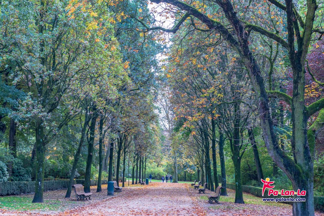 ทางเดินในสวนสาธารณะที่ขนาบด้วยต้นไม้สูงใหญ่