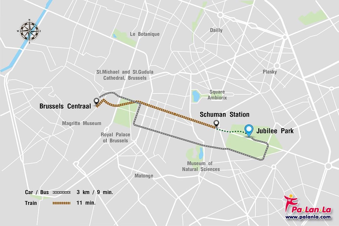 - รถยนต์ จากสถานีรถไฟกลางเมืองบรัสเซลส์ไปยังสวนจูบิลี่ ระยะทางประมาณ 3 กิโลเมตร ใช้เวลาเดินทางประมาณ 9 นาที