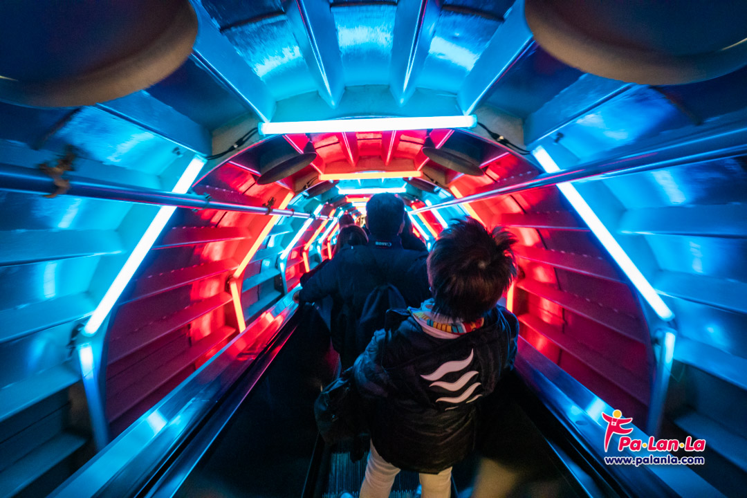 แสงสีดูล้ำสมัยของบันไดเลื่อนที่ใช้สัญจรไปยังจุดต่างๆ ของอาคาร