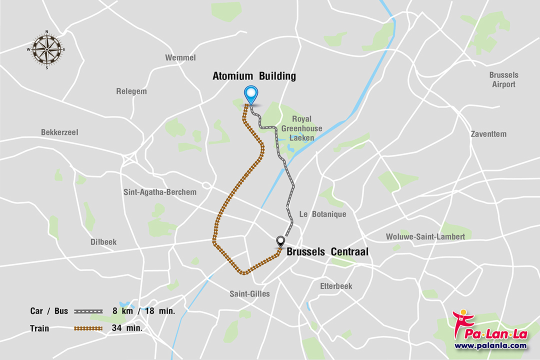 - รถยนต์ จากสถานีรถไฟกลางเมืองบรัสเซลส์ไปยังอาคารอะโตเมียม ระยะทางประมาณ 8 กิโลเมตร ใช้เวลาเดินทางประมาณ 17 นาที