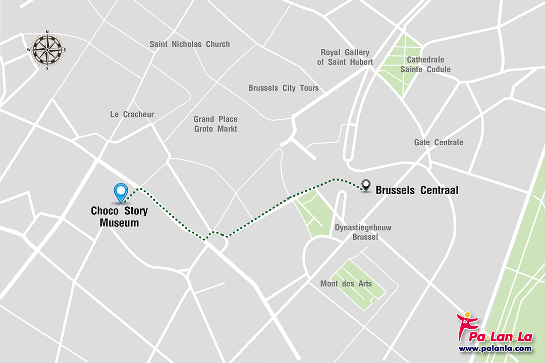 - เดิน จากสถานีรถไฟกลางเมืองบรัสเซลส์ สามารถเดินไปยัง พิพิธภัณฑ์ช็อกโกแลต ได้เลย ระยะทางประมาณ 550 เมตร ใช้เวลาเดินประมาณ 6 นาที