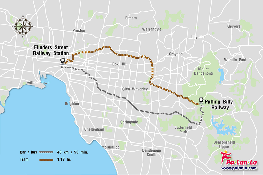 - รถยนต์ (Car) การเดินทางโดยรถยนต์จากบริเวณ Flinders Street Station ไปยัง Puffing Billy Railway โดยผ่านเส้นทางสาย M1 และ Wellington Rd มีระยะทาง 48.3 กิโลเมตร ใช้เวลาเดินทางประมาณ 52 นาที