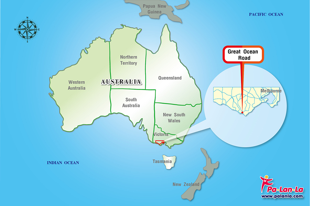 Great Ocean Road เป็นถนนเลียบชายฝั่งมหาสมุทรแปซิฟิกระยะทางประมาณ 243 กิโลเมตร โดยเริ่มต้นจากเมืองวอนัมบูล (Warrnambool) ไปจนถึงเมืองทอร์คีย์ (Torquay) ซึ่งเป็นเมืองเล็กๆ ใกล้กับเมืองจีลอง (Geelong) ซึ่งอยู่ไม่ไกลจากเมลเบิร์น (Melbourne) ตลอดเส้นทางเลียบมหาสมุทรของถนนสายนี้มีที่เที่ยวหลายจุดให้นักท่องเที่ยวได้แวะชมและถ่ายภาพอย่างเพลิดเพลินและน่าประทับใจ โดยส่วนใหญ่เป็นหน้าผาและเสาหินขนาดมหึมาที่ตั้งอยู่เลียบชายฝั่งซึ่งมีภูมิทัศน์งดงามจนเป็นที่ใฝ่ฝันของใครต่อใครให้อยากมาเยือน