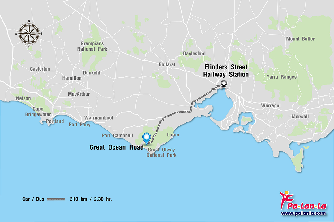Great Ocean Road อยู่ห่างจากตัวเมืองเมลเบิร์นออกไปประมาณ 242 กิโลเมตร นักท่องเที่ยวสามารถเดินทางไป Great Ocean Road ได้โดย