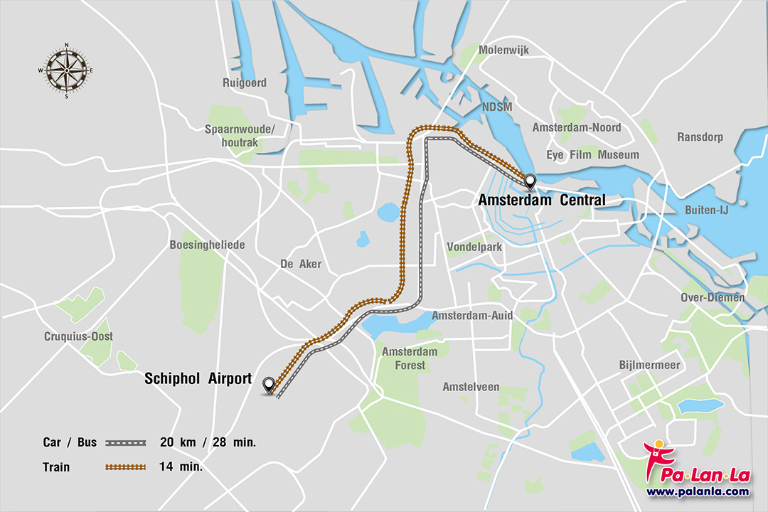 จากท่าอากาศยาน Amsterdam Airport Schiphol ไปสถานี Amsterdam Central ซึ่งเรียกได้ว่าเป็นศูนย์การของการเดินทางของเมืองอัมสเตอร์ดัม ที่ไม่เพียงแค่เป็นสถานีรถไฟที่ให้บริการรถครอบคลุมทุกเส้นทาง แต่ยังเชื่อมต่อกับการให้บริการรถโดยสารประจำทาง รถราง รถไฟใต้ดิน และเรือข้ามฟากอีกด้วย นักท่องเที่ยวสามารถเดินทางจากสนามบินมายัง Amsterdam Central Station ได้หลายวิธี ดังนี้