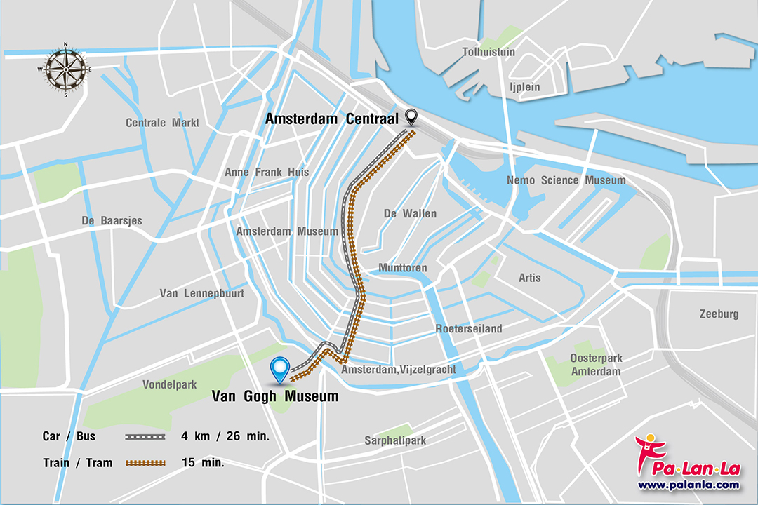 - รถราง (Tram) จากสถานี Amsterdam Central Station ขึ้นรถรางสาย 2 หรือ 12 Amstelstation ไปลงป้าย Amsterdam, Van Baerlestraat ที่อยู่ติดกับ Van Gogh Museum ได้เลยใช้เวลาเดินประมาณ 15 นาที