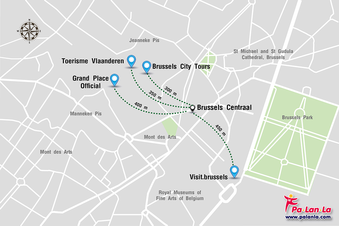 - สำนักงานการท่องเที่ยวเมืองบรัสเซลส์ (Grand Place Official) ระยะทางประมาณ 400 เมตร ใช้เวลาเดินประมาณ 5 นาที เปิดทุกวัน เวลา 09:00 น. – 17:45 น.