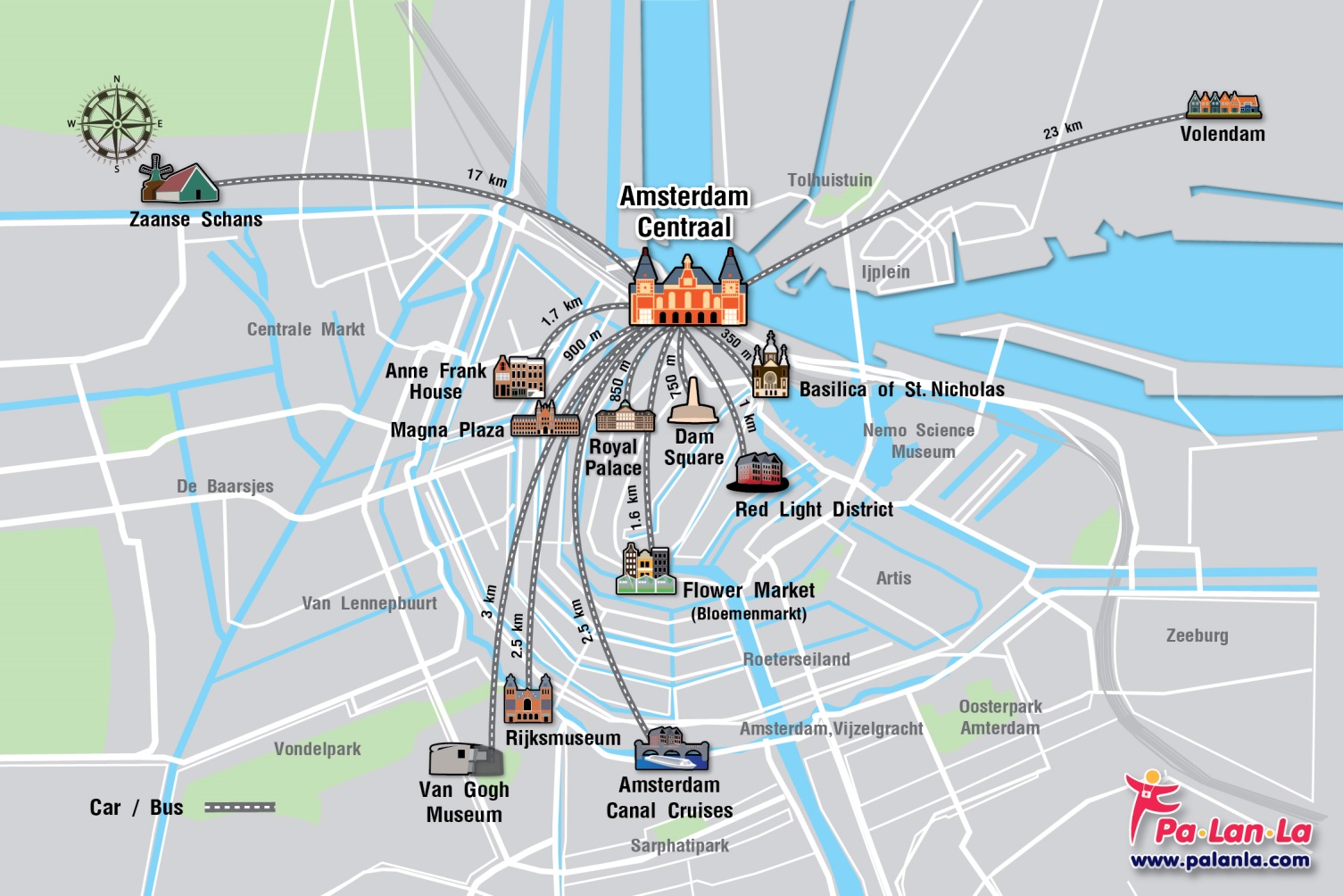 - รถยนต์ (Car) การเดินทางโดยรถยนต์จาก Amsterdam Central ไปยัง Zaanse Schans โดยใช้เส้นทางสาย A8 มีระยะทาง 17 กิโลเมตร ใช้เวลาเดินทางประมาณ 23 นาที