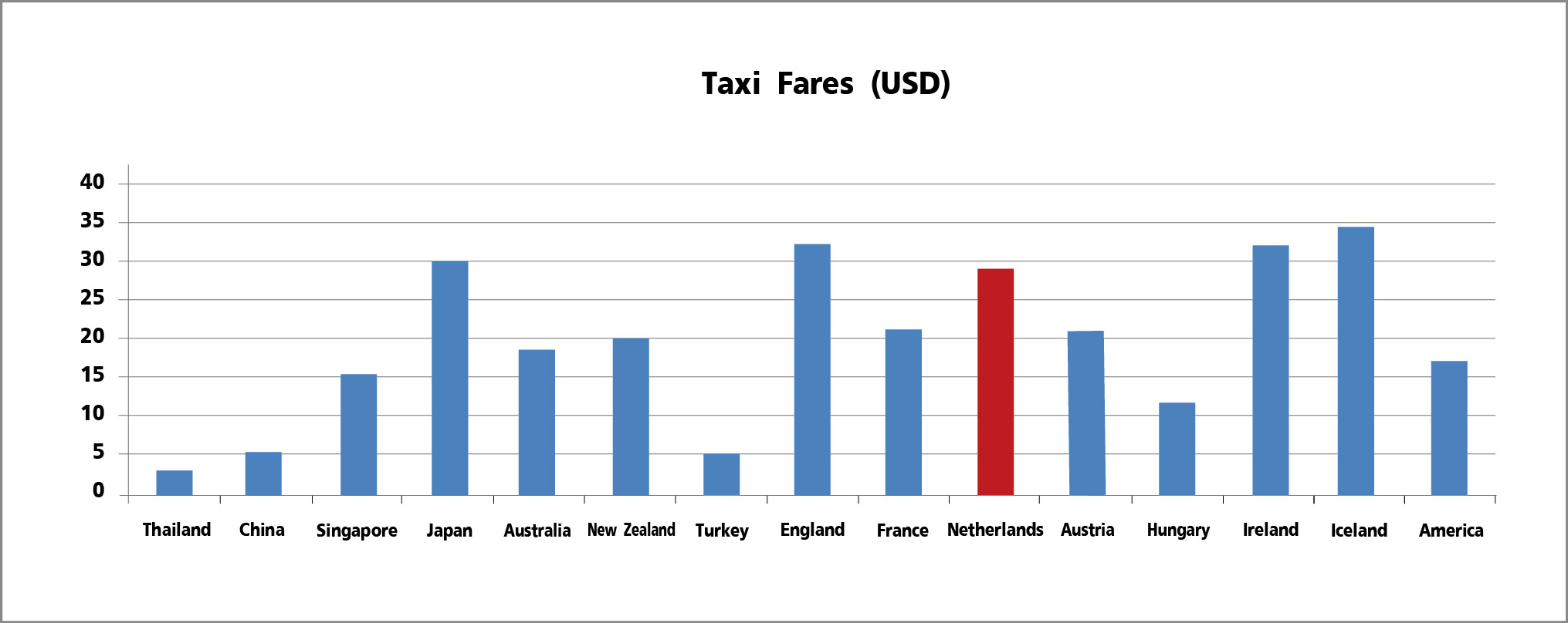 - แท็กซี่ (Taxi) การเดินทางโดยแท็กซี่จากสนามบินอัมสเตอร์ดัมไปยังตัวเมืองบริเวณสถานี Amsterdam Central มีค่าบริการอยู่ระหว่าง 33 - 40 ยูโร ขึ้นอยู่กับสภาพจราจร
