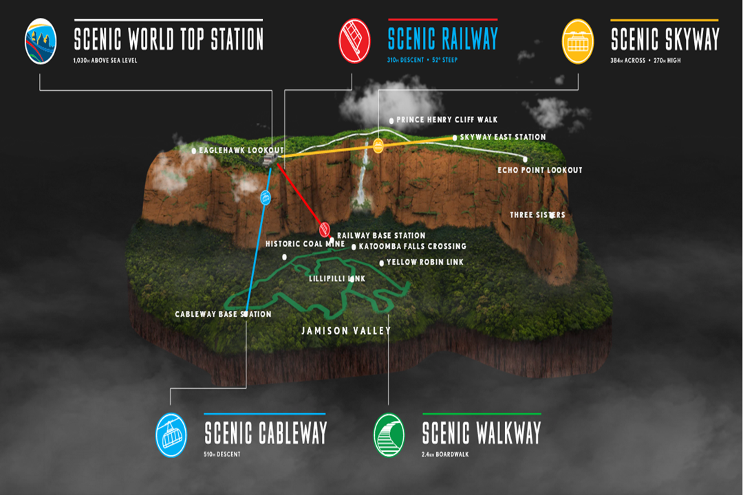 โดย Scenic World จะมีบริเวณที่เรียกว่า Top Station ซึ่งเป็นจุดรวมของสถานีสำหรับการขึ้น 1. Scenic Railway (เพื่อลงไปยังหุบเขาด้านล่าง) 2. Scenic Cableway (เพื่อลงไปยังหุบเขาด้านล่าง) 3. Scenic Skyway (ไม่ได้ลงไปหุบเขาด้านล่าง แต่จะแล่นมามาระหว่างหน้าผาด้านบนทั้งสองฝั่ง) ส่วน Scenic Walkway ซึ่งเป็นบอร์ดวอล์กเส้นทางเดินสำรวจธรรมชาติป่าฝนระยะทาง 2.4 กิโลเมตรนั้นจะอยู่บริเวณหุบเขาด้านล่างเมื่อนั่งรถรางScenic Railway หรือเคเบิ้ลคาร์ Scenic Cableway ลงไปแล้วนั่นเอง