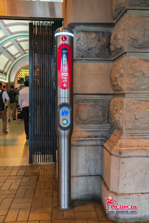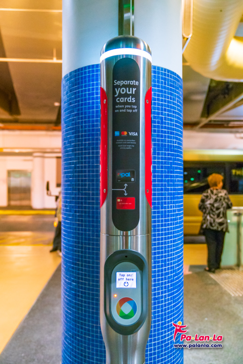 ขวามือของภาพ ตรงเสาสีส้มๆ คือที่แตะบัตร (Tap on / Tap off) ของสถานีบางแห่ง
