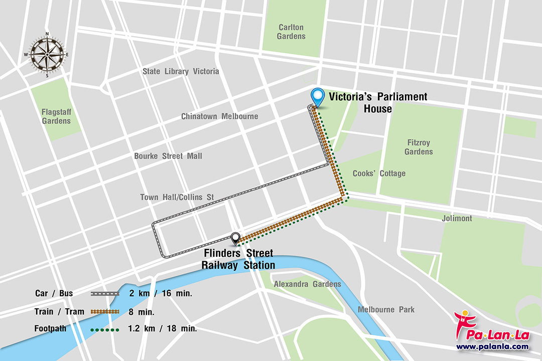 - การเดิน (Footpath) จากสถานีรถไฟ Flinders Street Railway Station นักท่องเที่ยวสามารถเดินไป Victoria’s Parliament House ได้ง่ายๆ โดยเดินไปตาม Collins St รวมระยะทาง 1.2 กิโลเมตร ใช้เวลาเดินประมาณ 18 นาที