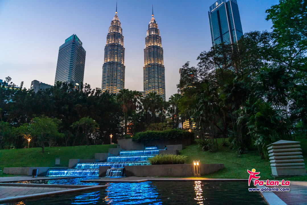 ช่วงเวลาถ่ายภาพที่แนะนำ : ในยามพลบค่ำสวนสาธารณะจะเปิดไฟประดับตามจุดต่างๆ นักท่องเที่ยวจะได้ภาพสีสันของสวนสาธารณะและตึกแฝดไปพร้อมกัน