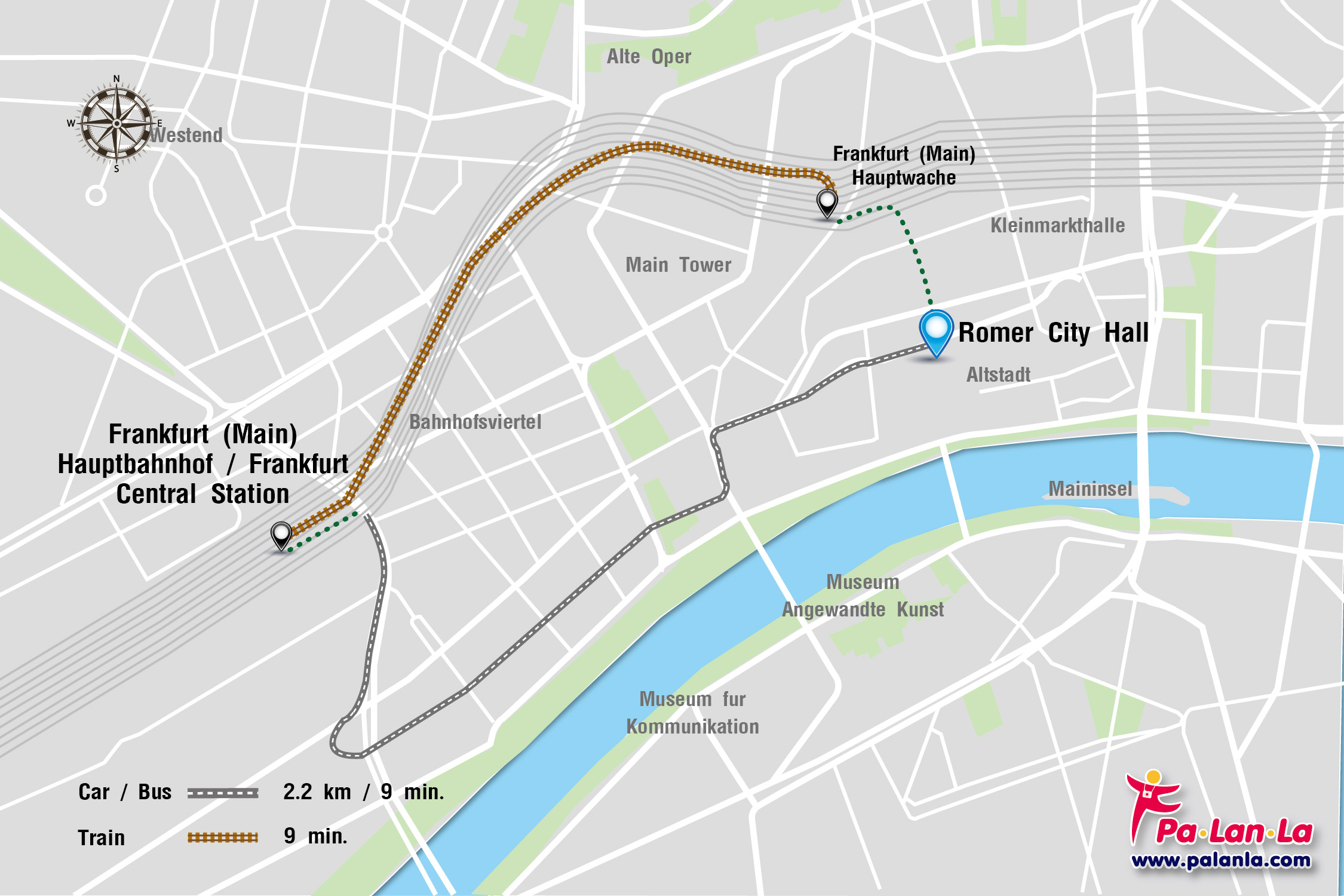 - รถยนต์ (Car) จาก Frankfurt (Main) Hauptbahnhof ไปยัง Romer City Hall มีระยะทางประมาณ 2.2 กิโลเมตร ใช้เวลาเดินทางประมาณ 9 นาที