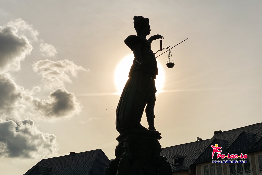 รูปปั้นเทพีแห่งความยุติธรรม (Statue of Lady Justice)มือหนึ่งถือดาบ อีกมือหนึ่งถือตราชั่ง